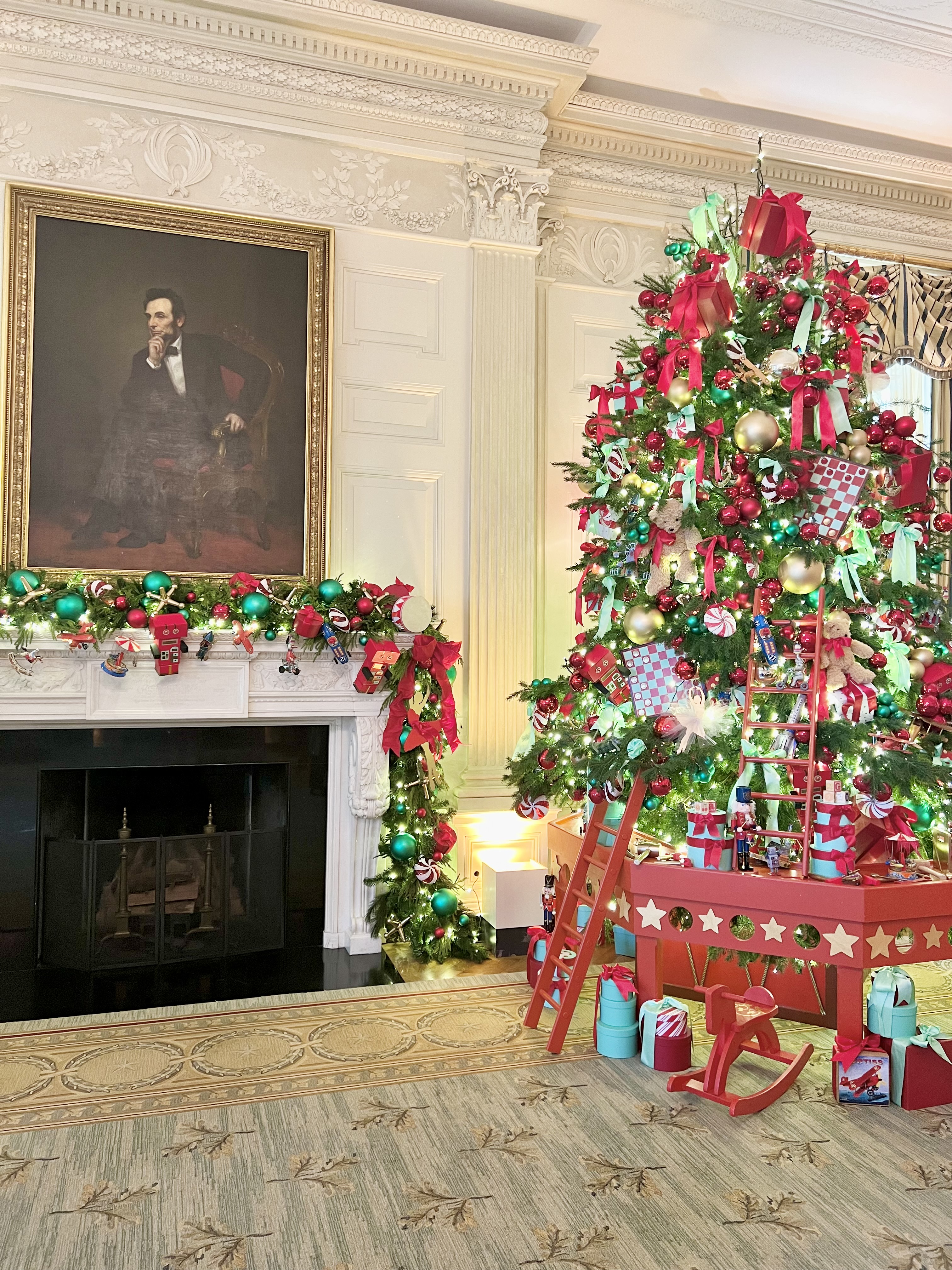 “They have an off-site warehouse that houses all of the decorations in it. Everything was actually pulled prior to us even arriving, so they have 11 semi-trucks full of Christmas decorations that were delivered to the White House,” she says, adding that about 70%-80% of the decorations were recycled from Christmas pasts.