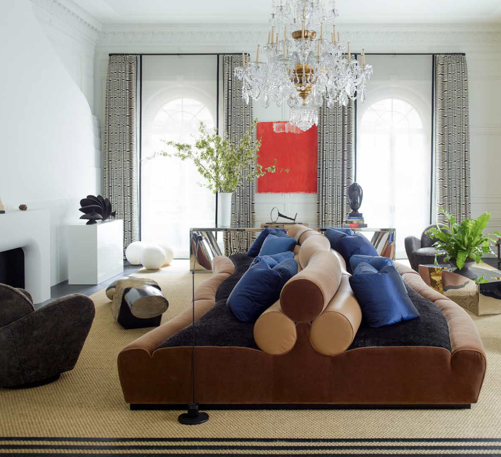 Legendary designer Juan Montoya envisioned a seventeen-foot-long, double-sided serpentine sofa scaled for a reception room in this New York’s Upper East Side mansion. Its form divides the room into two seating areas, which humanizes the grand-scaled space. Shearling-covered club chairs and a sculptural stainless steel desk add to the airy drama. The red painting, Choir, is by British artist Christopher Le Brun—photo credit Eric Piasecki, appearing in Interior Design Master Class from Rizzoli New York.