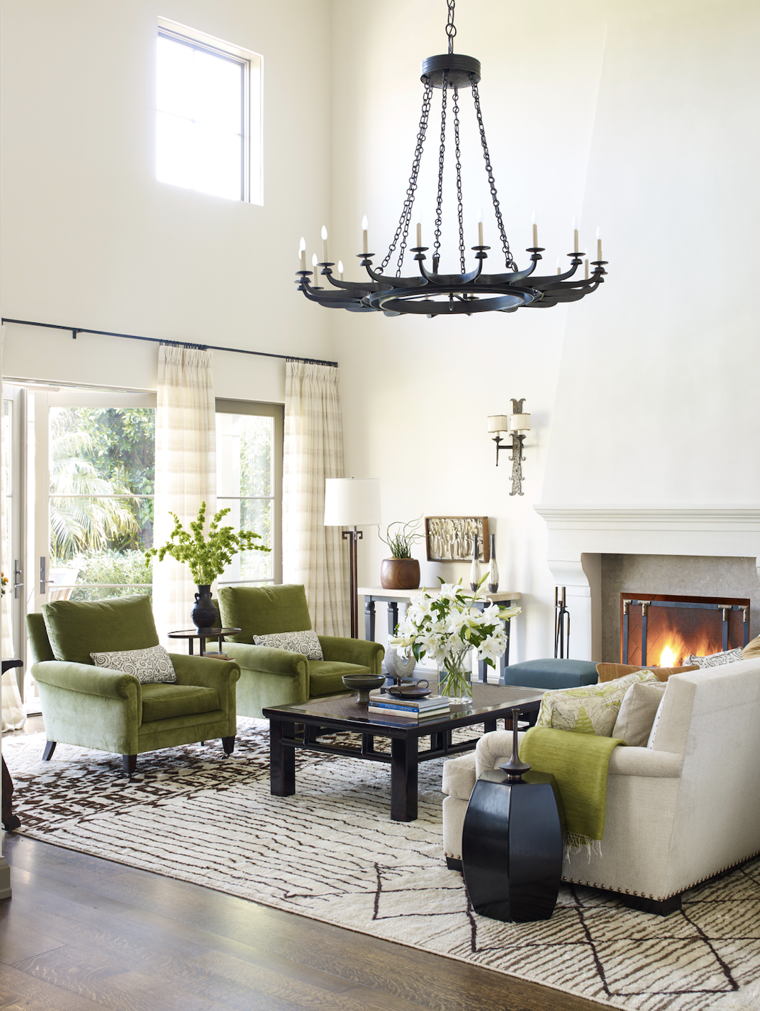 A soaring 18-foot ceiling presented a particular challenge in bringing the volume of this Madeline Stuart-designed living room in Los Angeles down to a human scale. An equally expansive chandelier, 6 feet in diameter and hung low on a long chain, accomplishes the task by lowering the center of gravity. Photographed by Victoria Pearson for the book “Interior Design Master Class” for Rizzoli, New York.