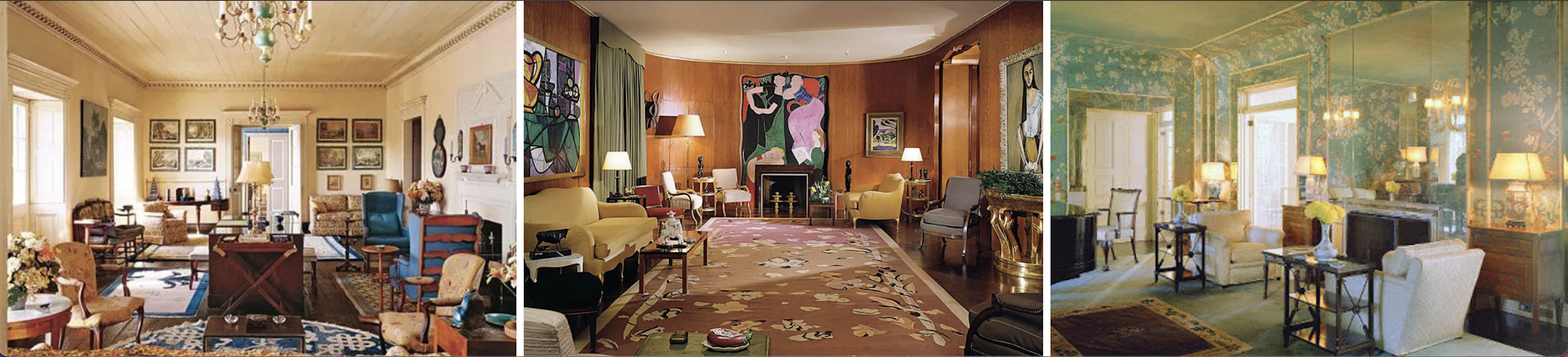 From left to right: Designed by Frances Elkins, the drawing room at Casa Amesti. Designed by Jean-Michel Frank, Rockefeller's salon showing the Léger mural and Giacometti andirons. Designed by Elsie de Wolfe, photographed by Simon Watson for House & Garden magazine.