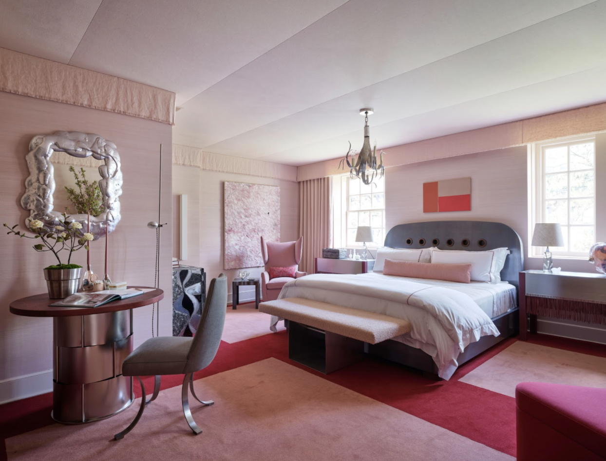 Decidedly feminine in pink with grey counterpoints defined Shawn Henderson’s bedroom for the 2024 Kips Bay Decorator Show House. Photo credit: Nickolas Sargent