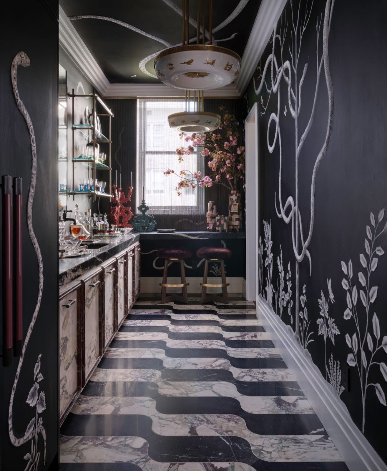 Michelle Gershon chose a meditation on black and white for her bar at the 2024 Kips Bay Decorator Show House. Photo credit: Nickolas Sargent