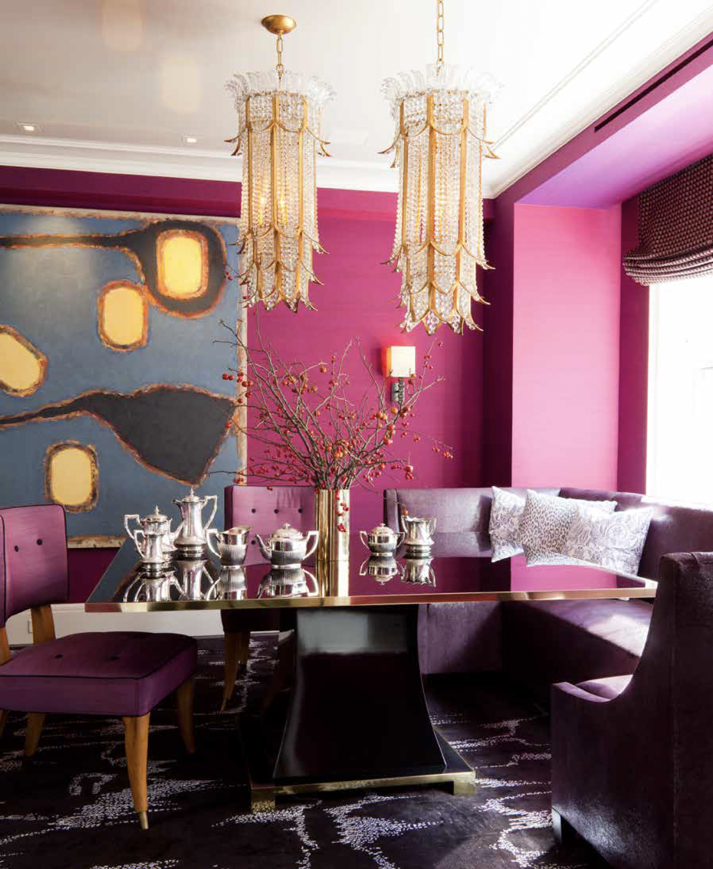 In a bold gesture embracing a pink palette, this Manhattan dining room designed by Amanda Nisbet is sheathed in magenta silk wallpaper. The custom black carpet with a subtle silver abstract motif adds to the drama, as does the black-glass tabletop. Photographed by Roger Davies for the book “